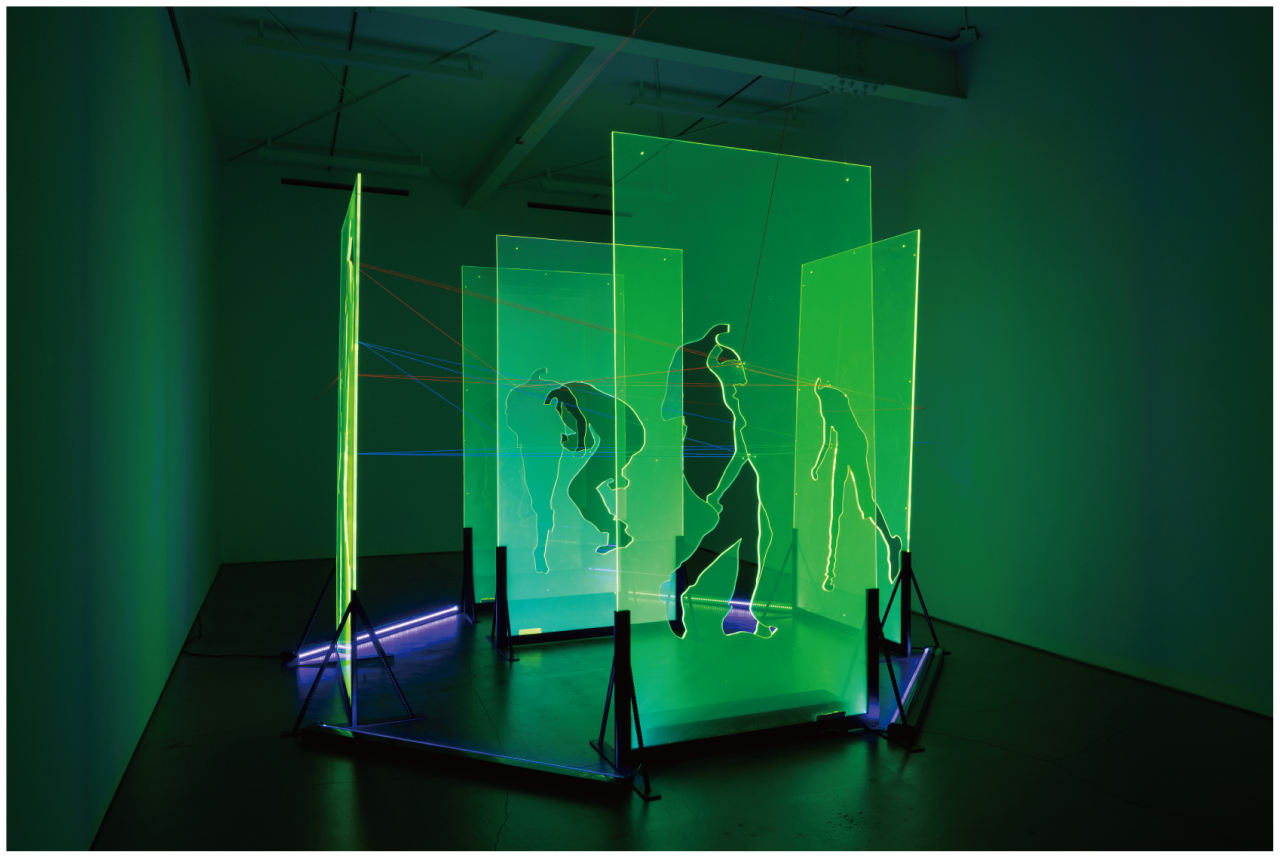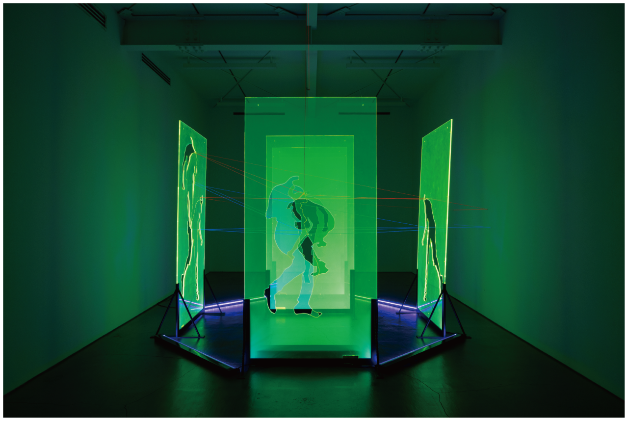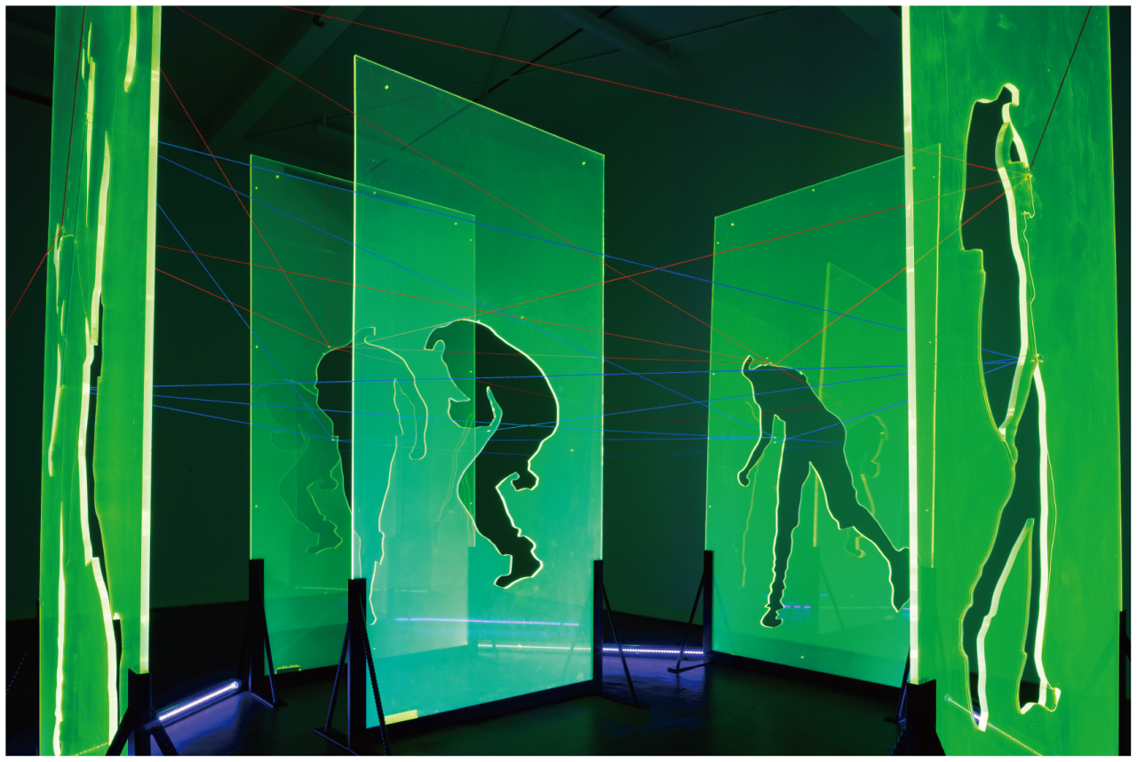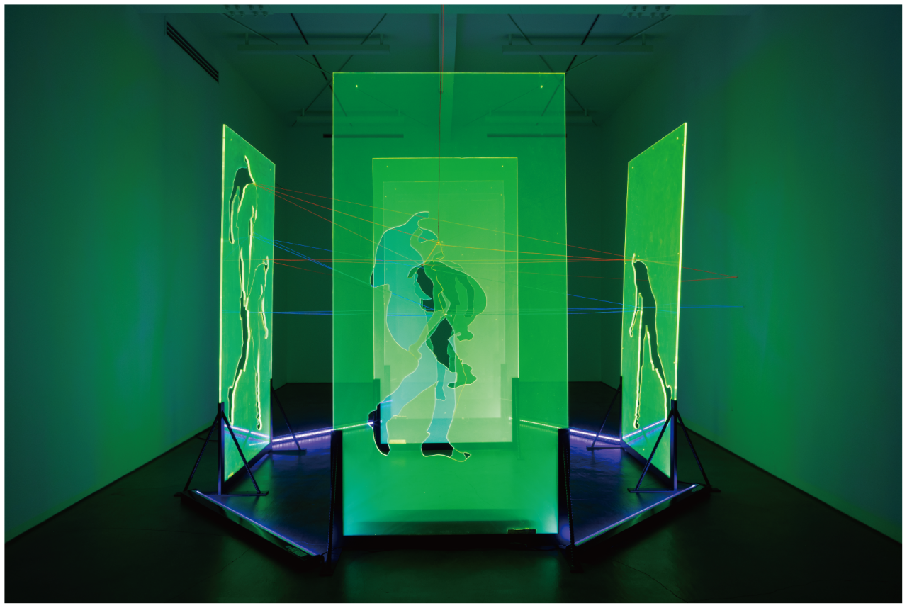 当時の最新技術を用いた画期的なインスタレーション作品はアクリルから切り抜かれた等身大の人型を繋ぐようにレーザー光線が